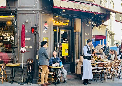 ⭐️Café Varenne. Go early for lunch (no later than 12:30) or be prepared to wait, as it gets bondé (crowded). Or better yet, reserve a table. This is one of my favorite restaurants to head to with a friend. The graphic red floor tiles, the back room with its colorful posters—the servers in classic aprons and black vests. It’s a casual but elegant vibe, very friendly, and you’ll see both tourists and real French people there because it’s actually good. They do have tables outside, and just around the corner on rue Varenne, they’ve got a tiny seafood comptoir as well.