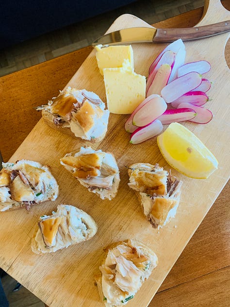 Pain aux tartinables. Tartinable means “spreadable” so these are just small slices of good bread or toast rounds, topped with tasty spreads. Could be an olive tapenade, a salmon cream spread, or really any combination. I also really like to use concombre (cucumber) sliced into rounds instead of bread, and put the tartinables on top.